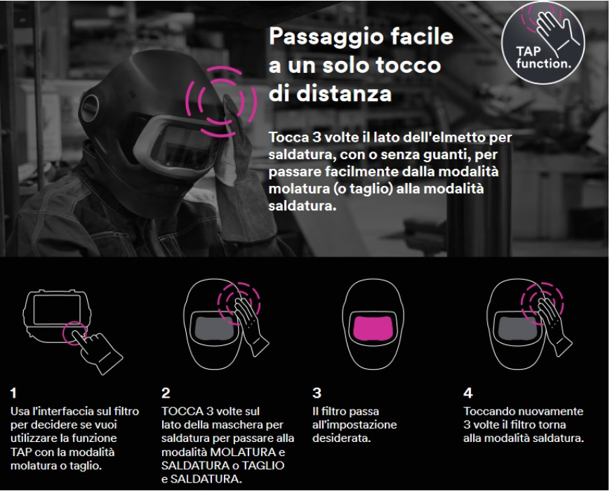 This version is equipped with the TW self-darkening filter which, in addition to providing perfect protection during MIG/MAG, TIG and MMA welding, has a tack mode that provides an intermediate degree of protection during return to clear in spot welding.