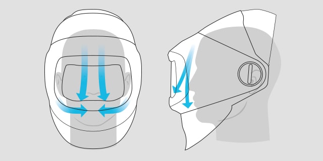 The welder can decide to direct the airflow towards the face, the lens or an intermediate position in addition to the amount of air coming from the top or the two side intakes.
