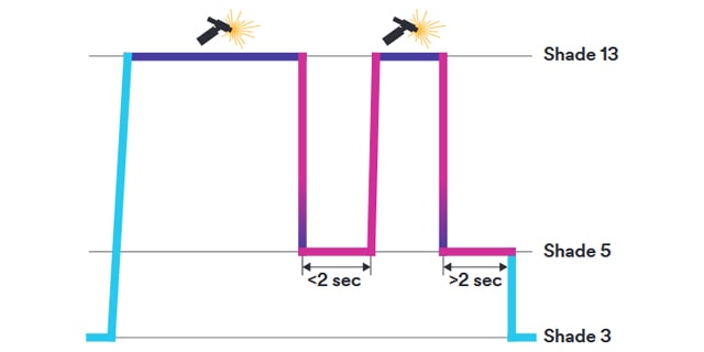 Human eyes are not suited to handle rapid transitions from dark to light and vice versa. The G5-01 mask uses an intermediate darkening grade DIN 5 to minimise eye fatigue during spot welding. If an arc is not emitted within 2 seconds, the filter returns to its normal DIN 3 light state.