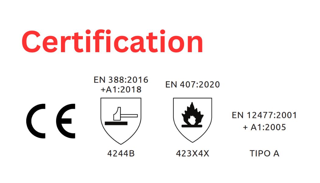 Fully welted, CE approved. Cat. 2. Tested against mechanical stress such as abrasion, cut, tear and puncture Tested for thermal performance such as exposure to an open flame, contact heat, convective heat, radiant heat, small and large splashes of molten metal